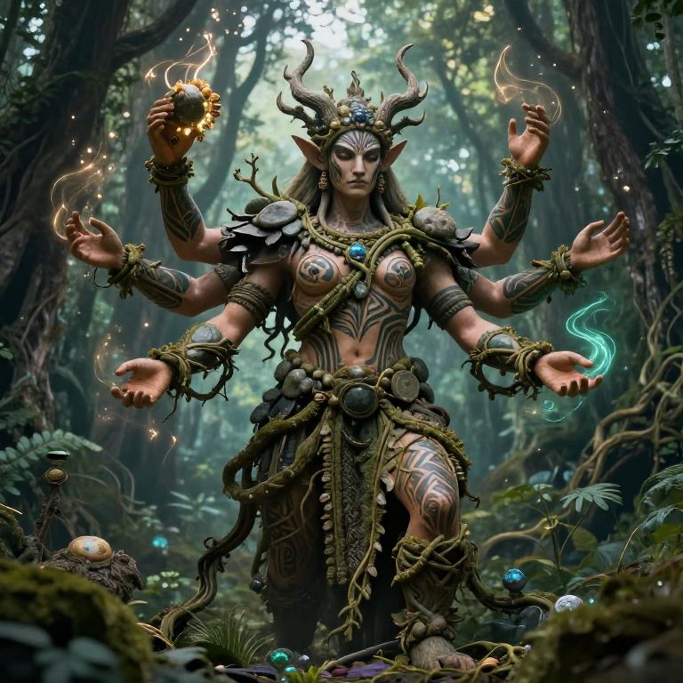 Digital fantasy artwork of a multi-armed, elven goddess standing in a dense, enchanted forest. She has dark, glowing tattoos covering her nude, muscular body, and wears a crown with twisted horns. Her six arms each hold a different magical element: fire, water, earth, air, and a glowing orb. She is adorned with intricate, nature-inspired armor and jewelry, including a necklace with a blue gem. Her pointed ears and intense gaze add to her mystical aura. The forest background is lush, with tall trees, glowing mushrooms, and ethereal light filtering through the canopy. The image is highly detailed and vibrant.