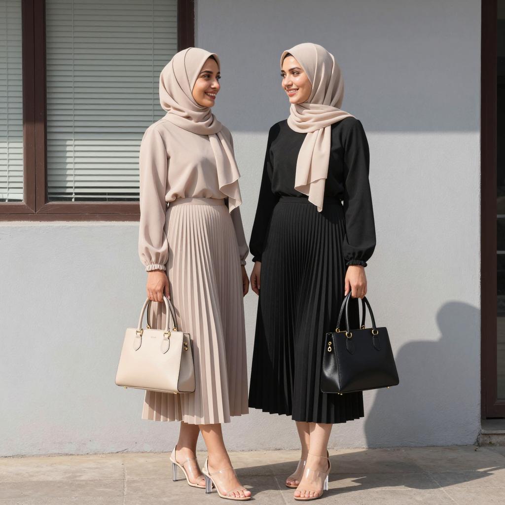 Two women standing on a sidewalk. Both wear beige hijabs and long-sleeve tops, beige and black respectively. The woman on the left wears a beige pleated skirt and clear high-heeled sandals, holding a beige handbag. The woman on the right wears a black pleated skirt and transparent high-heeled sandals, carrying a black handbag. Light gray building wall in background, window with blinds on the left. Sunlight casts shadows on the ground.