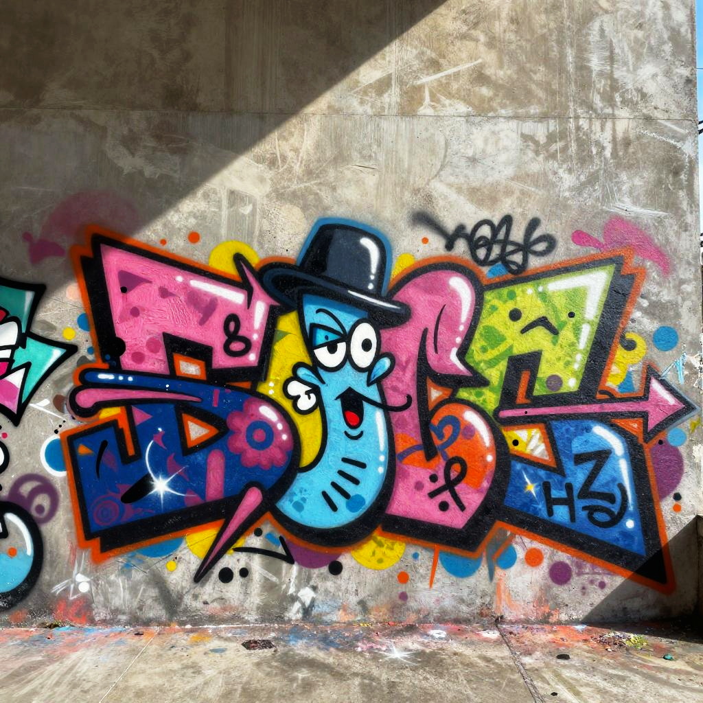 Siiii graffiti style urban wall art, bold color contrasts with spray paint texture, edgy street culture vibe, lively characters and symbols, dynamic composition with chaotic energy, sharp shadows, sunlight reflections, high detail