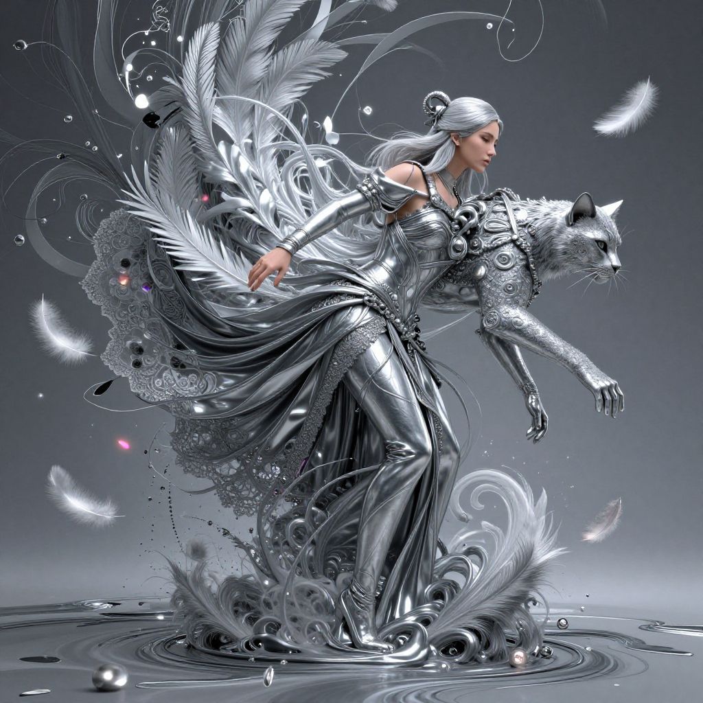 ((3/4 body shot:1.6), (Masterpiece, photorealistic, photo realism, best quality, ultra-detailed:1.3), (nice hands, perfect hands), official art, cinematic light, (1girl:1.3), adult, absurdres, 3D Illustration. Surreal, realistic, silver monochromatic female, clothed in molten silver filagree, falling, stalking feline, posing, weaving silver inks and lace, plumage, flow, sinuous lines, floatin, colorful ribbons of ink swirl up from the ground, particles in the air, floating glowing feathers, abstract background, complexity of details, patterned object, Concept art, fine art, high resolution, beautiful face
