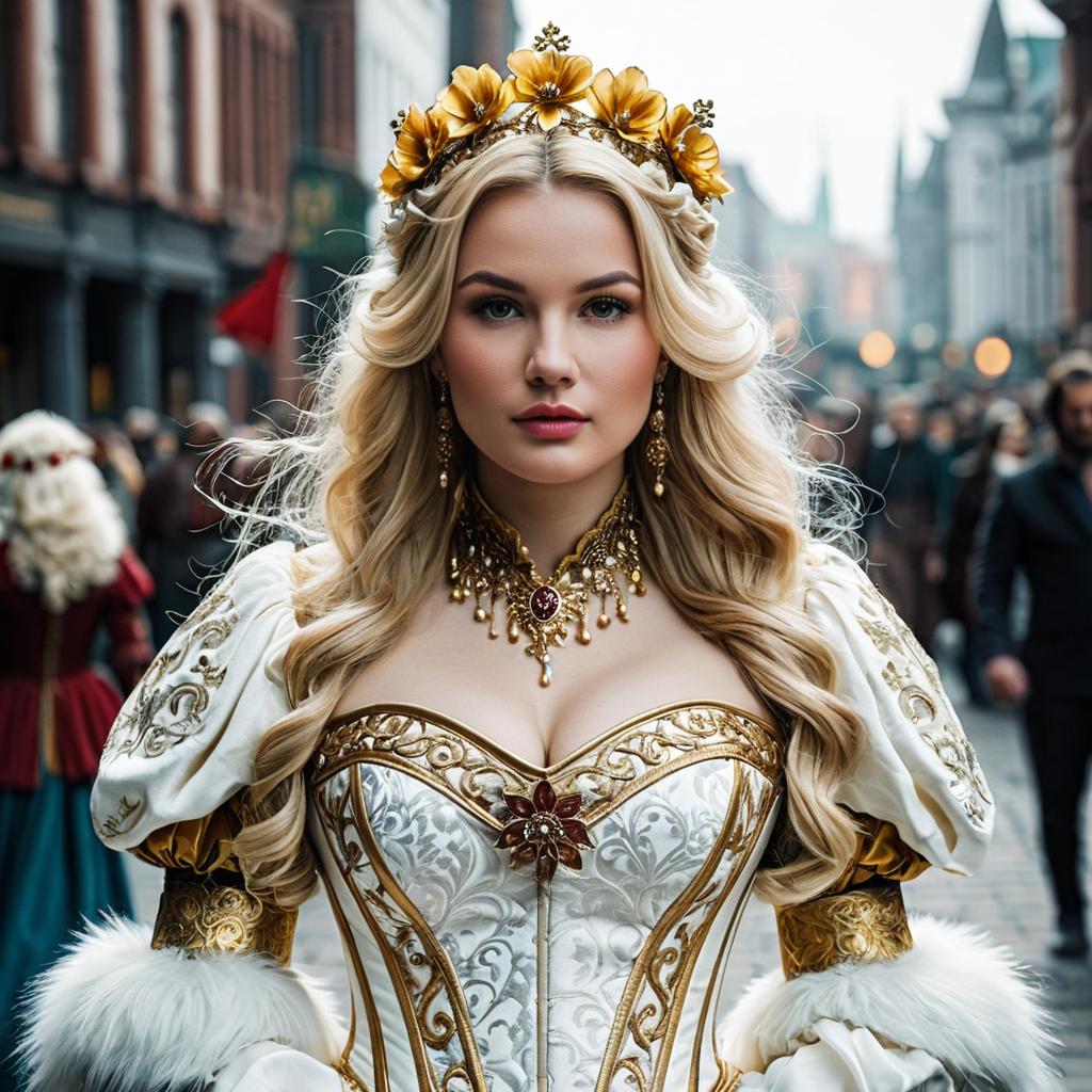 Lady dimitrescu cosplay, photorealistic, blonde woman, fantasy medieval dress, gold and white, puffed fur sleeves, detailed corset, long wavy hair, flower headpieces, strong jawline, fair skin, serious expression, blurred background, city street, daylight, elegant, high quality, detailed ures, digital art, highly detailed, ornate jewelry, realistic lighting, regal, T2I model, cosplay style
