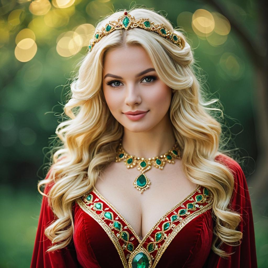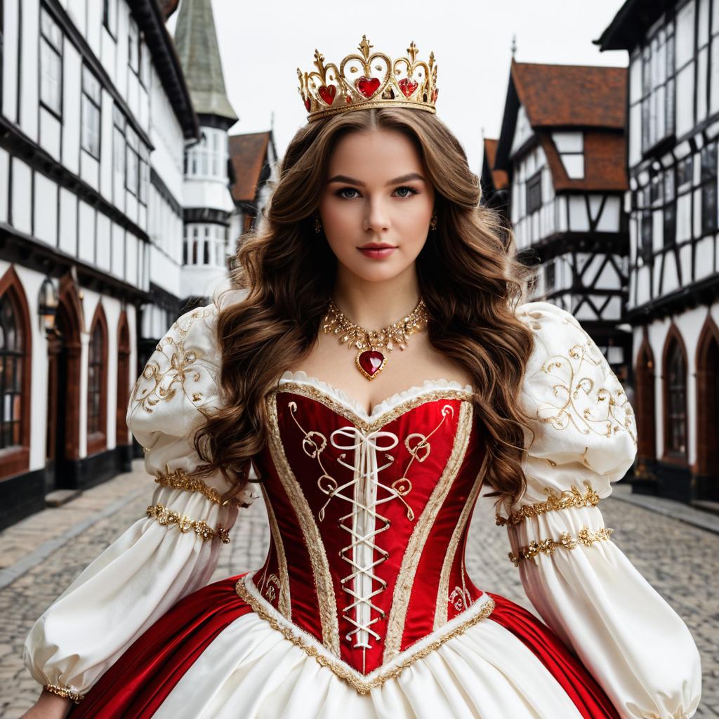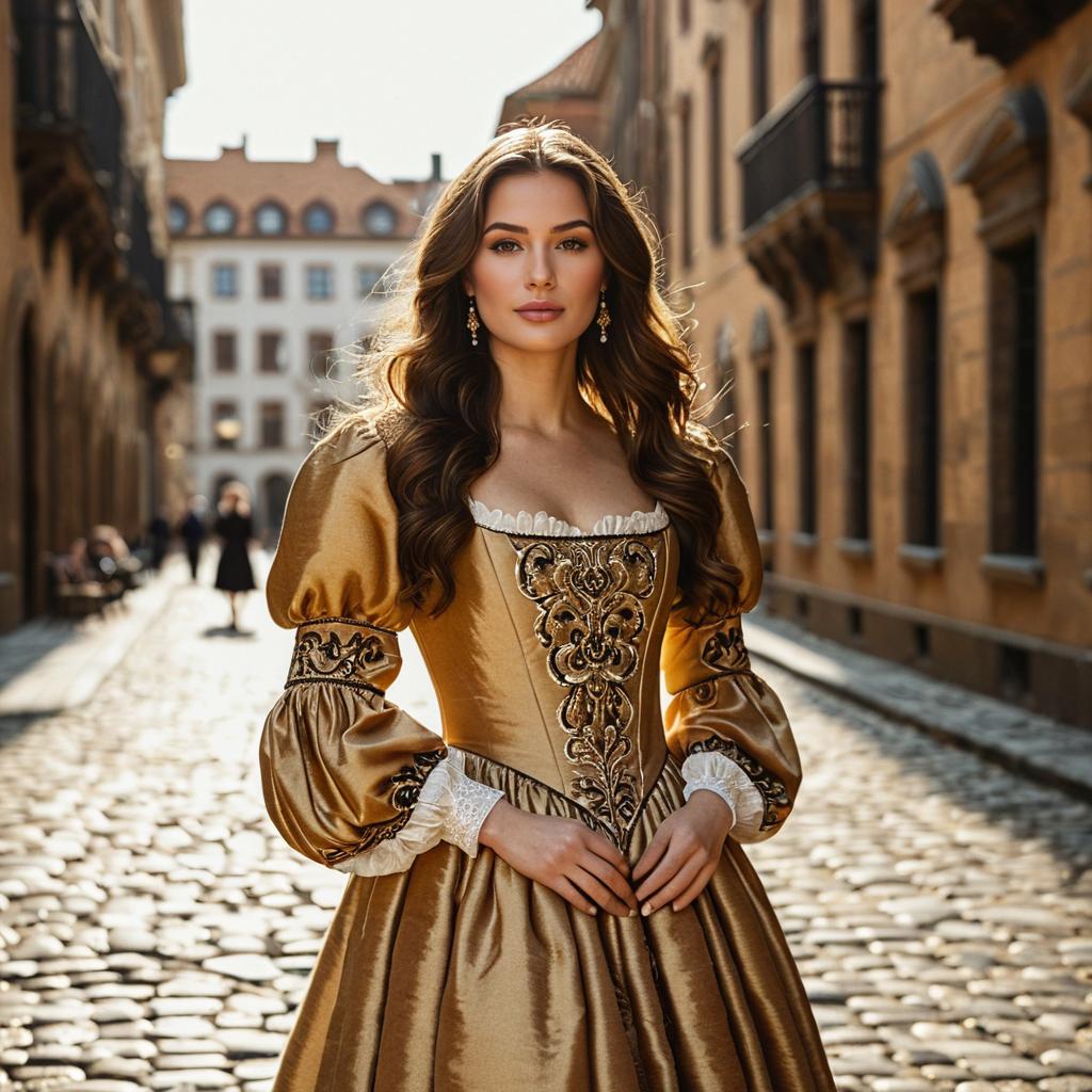 Photorealistic image of a blonde woman wearing a detailed gold and white medieval fantasy dress with puffed fur sleeves and an ornate corset. She has long wavy hair adorned with a golden flower headpiece, and wears intricate gold jewelry including earrings and a necklace. The setting is a city street during daylight with a blurred background, emphasizing her elegant and regal appearance.