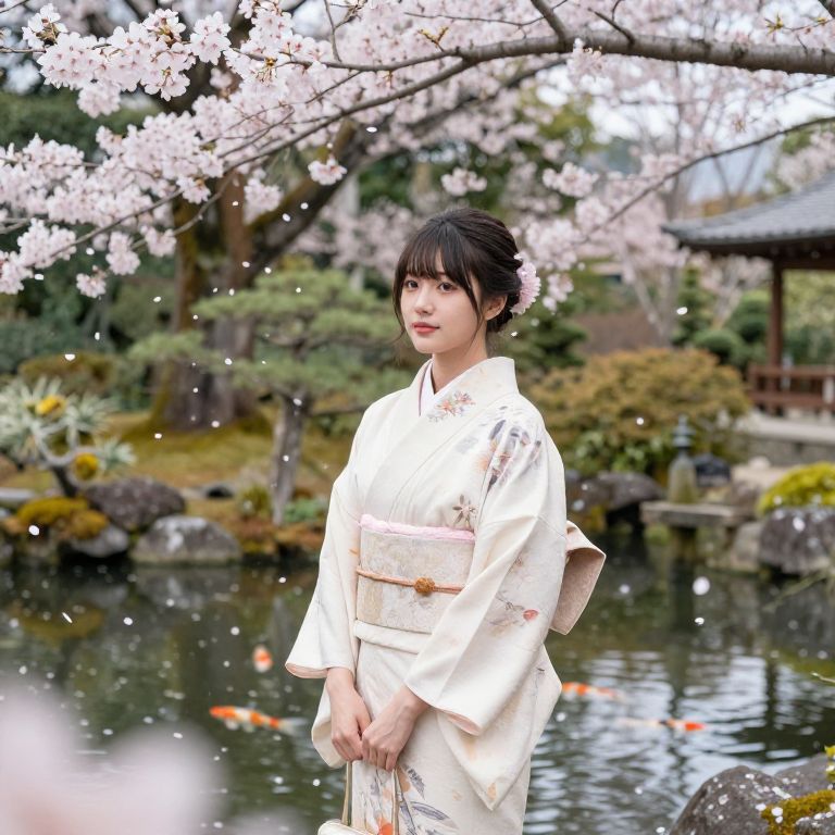 Young Asian woman wearing a traditional light-colored kimono with delicate patterns, standing in a serene Japanese garden during cherry blossom season. Soft pink sakura petals drift through the air around her. She stands beside a tranquil pond with visible koi fish, surrounded by rocks, greenery, and traditional wooden garden structures. The natural lighting and harmonious composition emphasize peace and beauty.