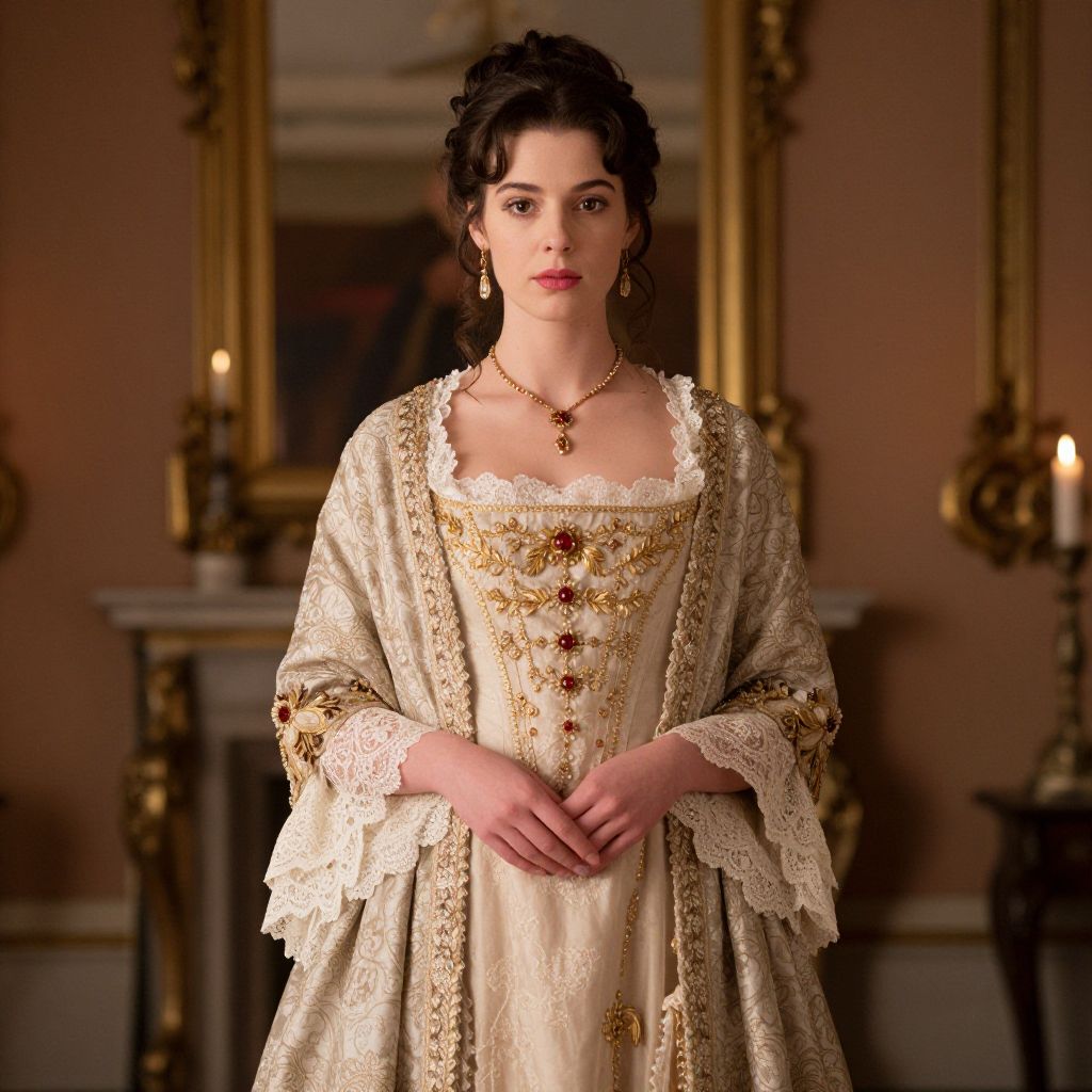 A woman in a richly detailed, vintage-inspired gown with intricate lace and gold embellishments stands elegantly in a warmly lit, opulent setting reminiscent of the Downton Abbey aesthetic, showcasing a blend of classic elegance and dramatic lighting effects.