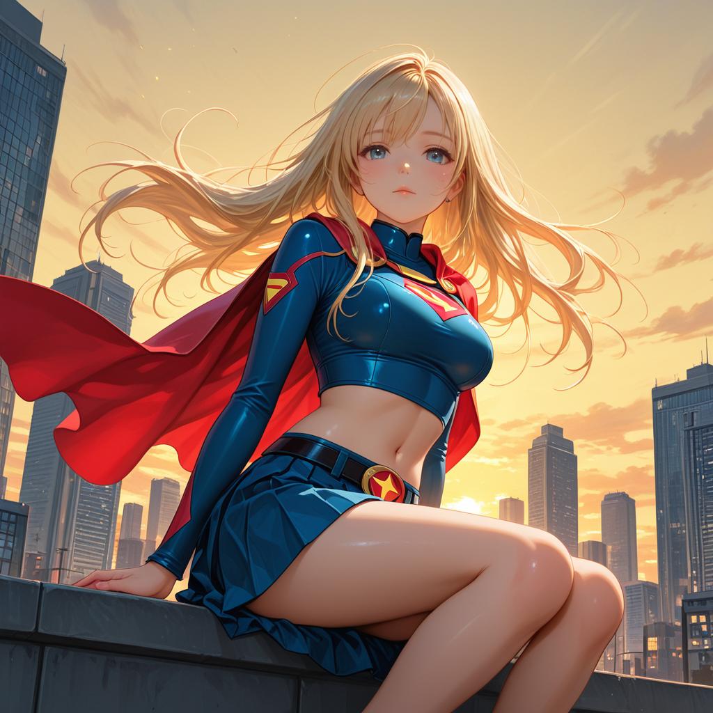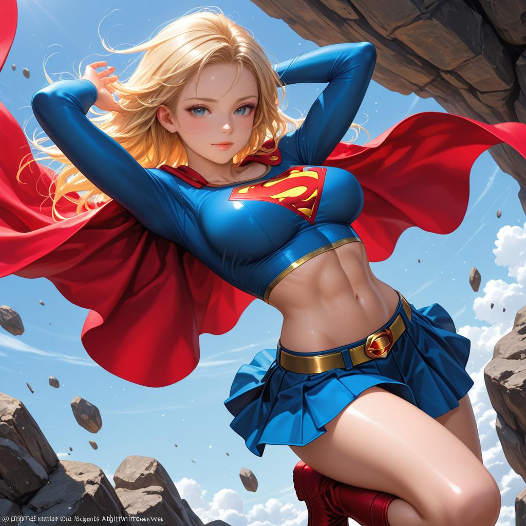 Jim lee, 1girl, supergirl, sky, abs, arms up, belt, belt buckle, blonde hair, blue eyes, blue skirt, boots, breasts, buckle, cape, crop top, day, emblem, eyelashes, flying, gold belt, gold trim, impossible clothes, impossible shirt, large breasts, long hair, long sleeves, looking at viewer, microskirt, midriff, navel, nose, outdoors, parted lips, pleated skirt, red cape, red footwear, rock, shadow, shirt, skirt, smile, solo, superhero, toned, watermark, yellow belt