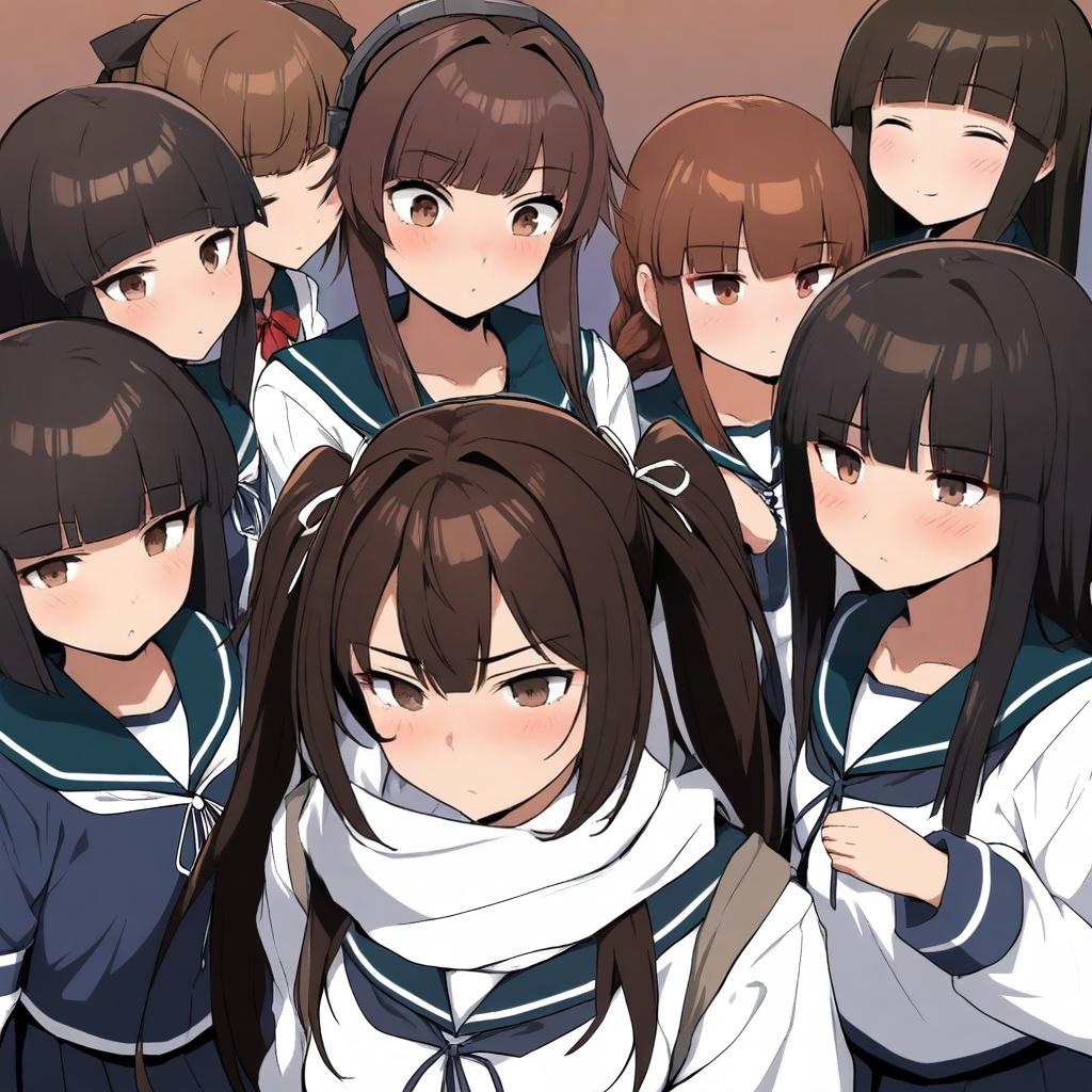 Swf, SFW, hatsuyuki_kancolle, multiple girls, braid, serafuku, 6girls, school uniform, brown hair, long hair, ribbon, hair ribbon, brown eyes, ponytail, blush, tress ribbon, blunt bangs, short hair, scarf, closed eyes, black hair, headgear, sailor collar, twintails