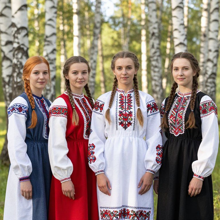 Most beautiful Russian girls in traditional folk dresses, standing in a sunlit birch forest, soft natural light, intricate embroidery, serene expressions, vibrant colors, highly detailed