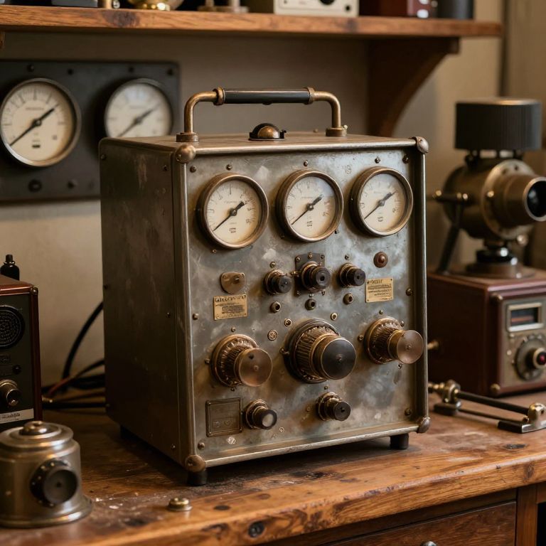 Vintage messmaschine device on a wooden workbench, surrounded by analog gauges and dials, nostalgic industrial setting with warm lighting, detailed textures of metal and worn surfaces, steampunk aesthetic blending old and new technologies