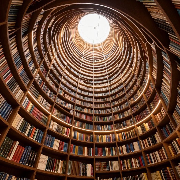 Photograph of a grand, circular library with towering, spiral shelves filled with colorful books. The shelves create a mesmerizing, concentric spiral pattern leading to a bright, circular skylight at the center. Warm, golden lights illuminate the shelves, highlighting the diverse book spines. The image captures the rich textures of wood and the varied colors of the books, evoking a sense of intellectual wonder and architectural beauty.