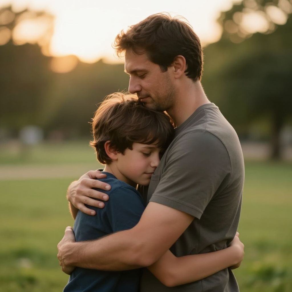 Emotional father and son images showing tender moments of bonding, warm hugs, and heartfelt expressions in a serene park setting during golden hour, soft lighting, photorealistic style.