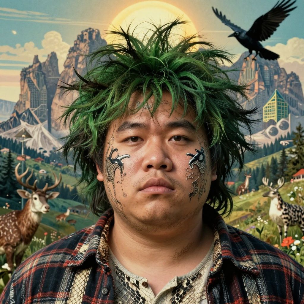 Photograph of an Asian man with green, spiky hair, wearing a plaid shirt and a silver-patterned undershirt. His face is adorned with black, tribal-like face paint on both cheeks. The background is a surreal landscape featuring a bright sun, jagged mountains, and a forest filled with deer, a black bird in flight, and abstract city buildings. The image blends realistic elements with fantasy, creating a vivid, otherworldly scene. The man's expression is neutral, and the overall style combines natural and digital art techniques.