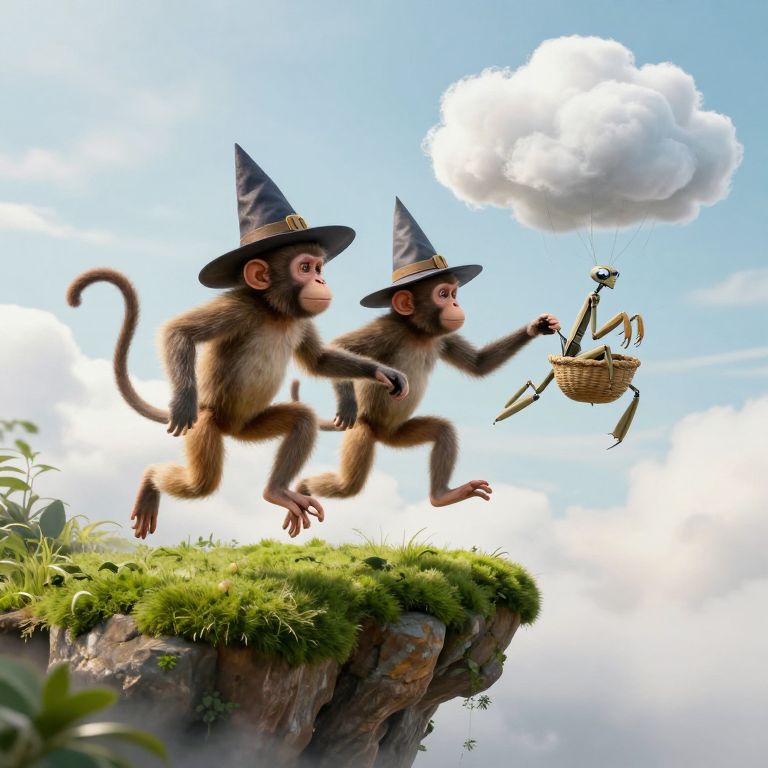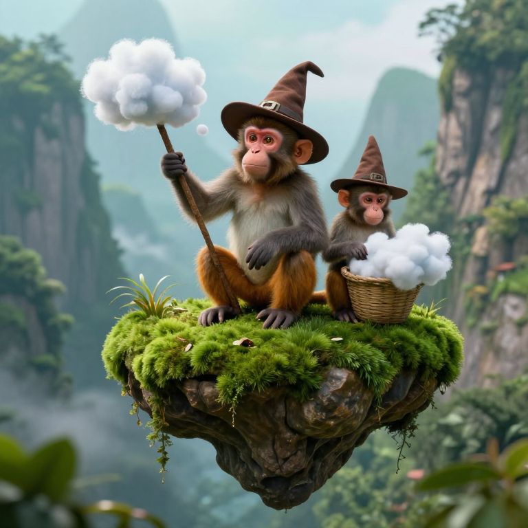 Two playful monkeys adorned with wizard hats perch atop a mythical creature with antlers and a moss-covered back, defying gravity as they harvest fluffy clouds in woven baskets suspended by delicate threads.