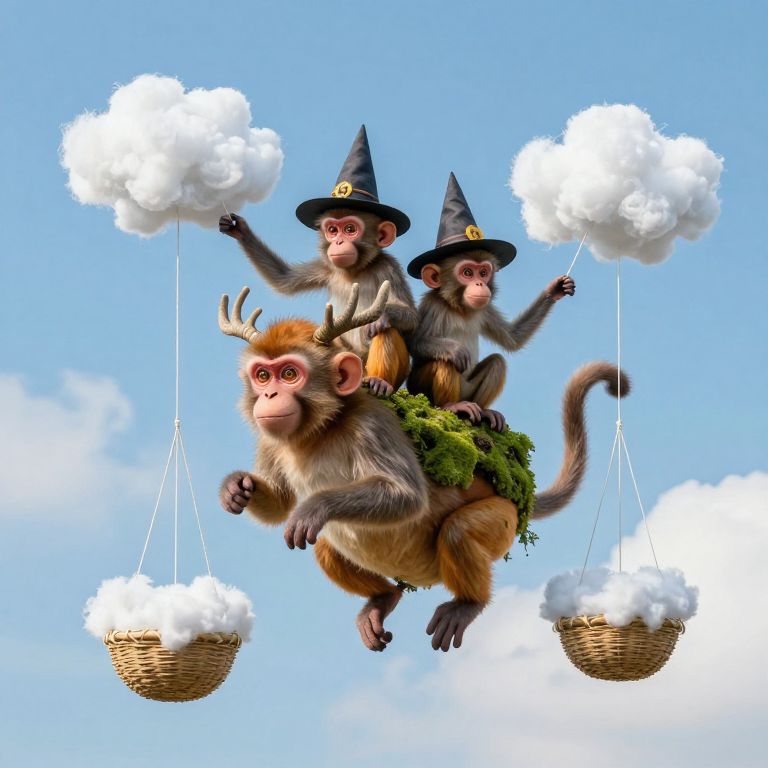 A digital illustration depicts three anthropomorphic monkeys with large, expressive eyes and human-like features, wearing black witch hats with gold buttons. They sit on a brown, furry monkey with antlers, which is flying through a bright blue sky with scattered white clouds. The monkeys hold onto cloud-like puffs with wooden baskets suspended from strings. The monkeys' fur is a mix of gray and brown, and they have green moss on their backs. The scene is whimsical and fantasy-like, with a playful and magical atmosphere.