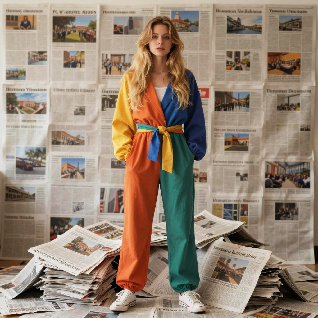 Young Woman in Colorful Jumpsuit Against Newspaper Wall