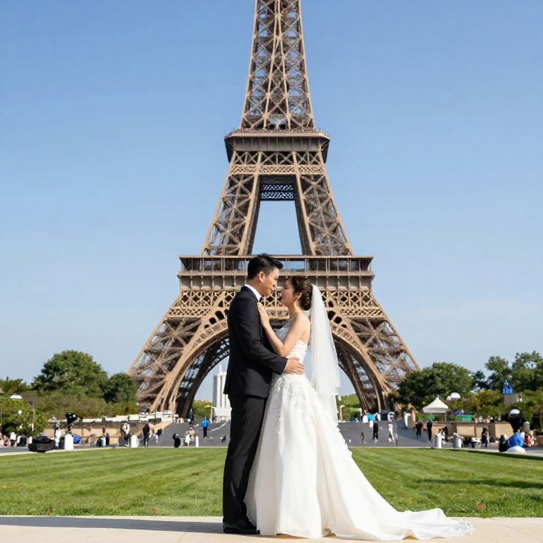 Photograph of Asian bride in white gown and groom in black suit kissing in front of Eiffel Tower on sunny day.