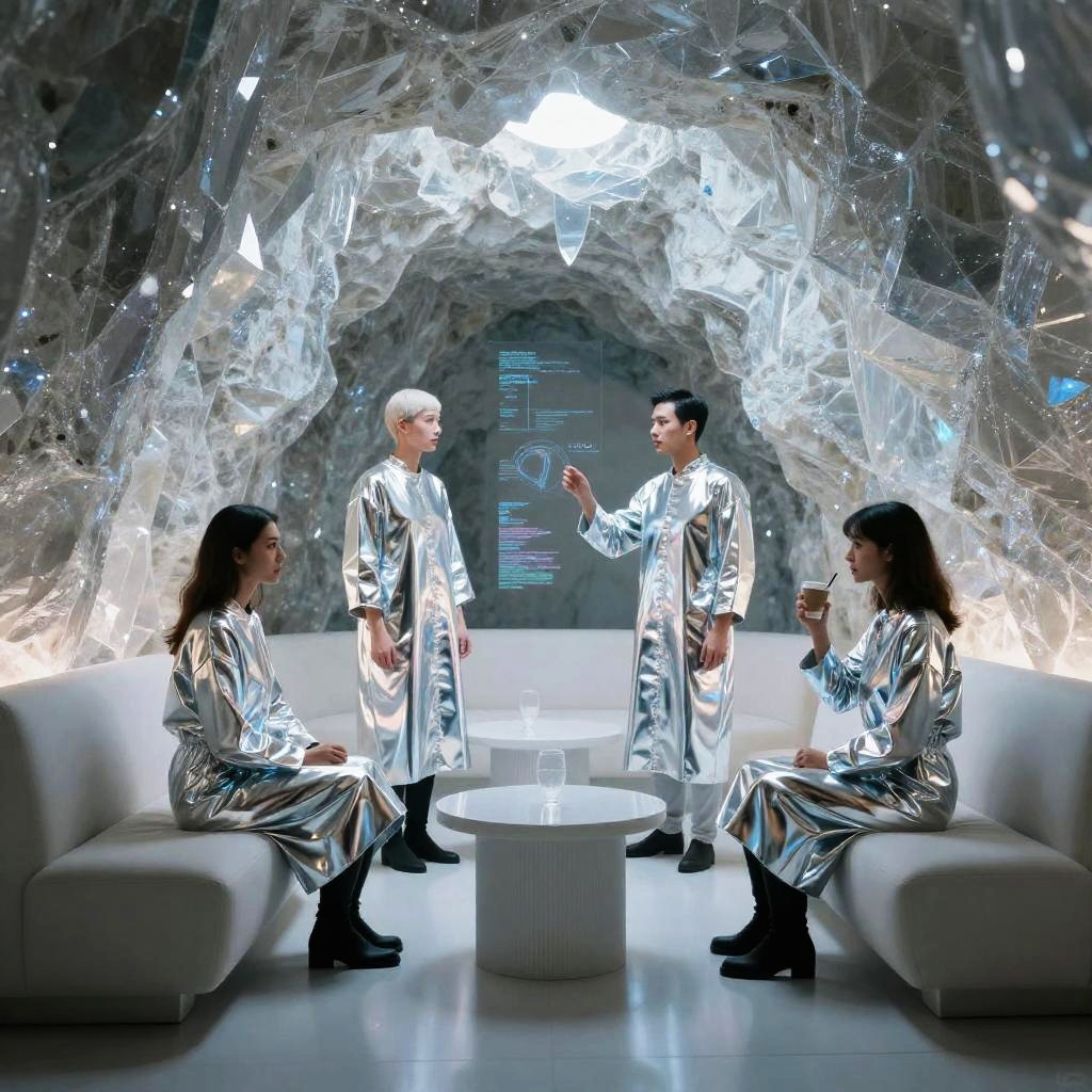 A futuristic minimalist shot of synthetic illusionists and data bards wearing chromed reflective cloaks, set in a glowing crystal cave lounge. Designed by Daniel Libeskind, captured with Fujifilm, experimental and stylish composition