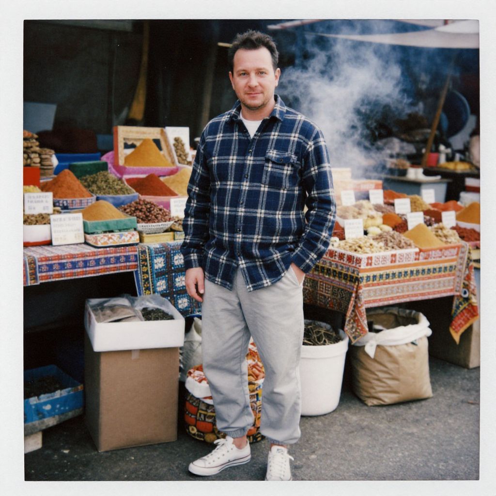 Photograph of a bearded man in a blue plaid shirt and gray pants, standing at a spice market stall with colorful spices and smoke. White