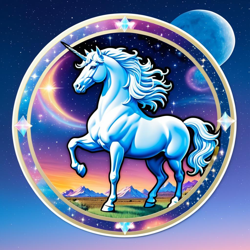 Stereoscopic Rendering style of Scott Gustafson, fantasy icon sticker with a celestial sky background, featuring a majestic unicorn in a circle frame
