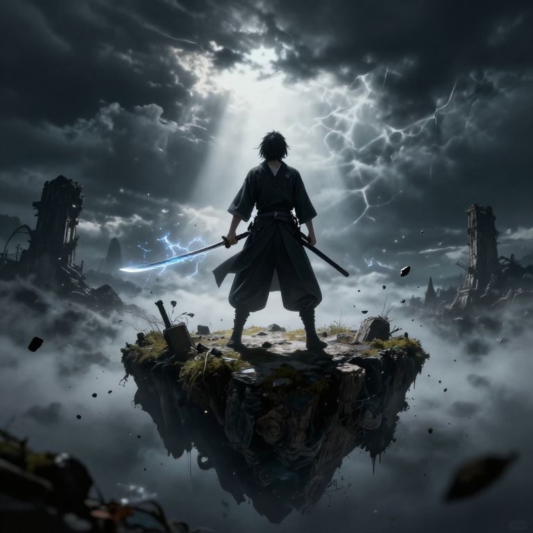 Anime-style digital artwork of a black-haired samurai in armor, holding a glowing sword, standing on a rooftop with lightning illuminating a neon-lit