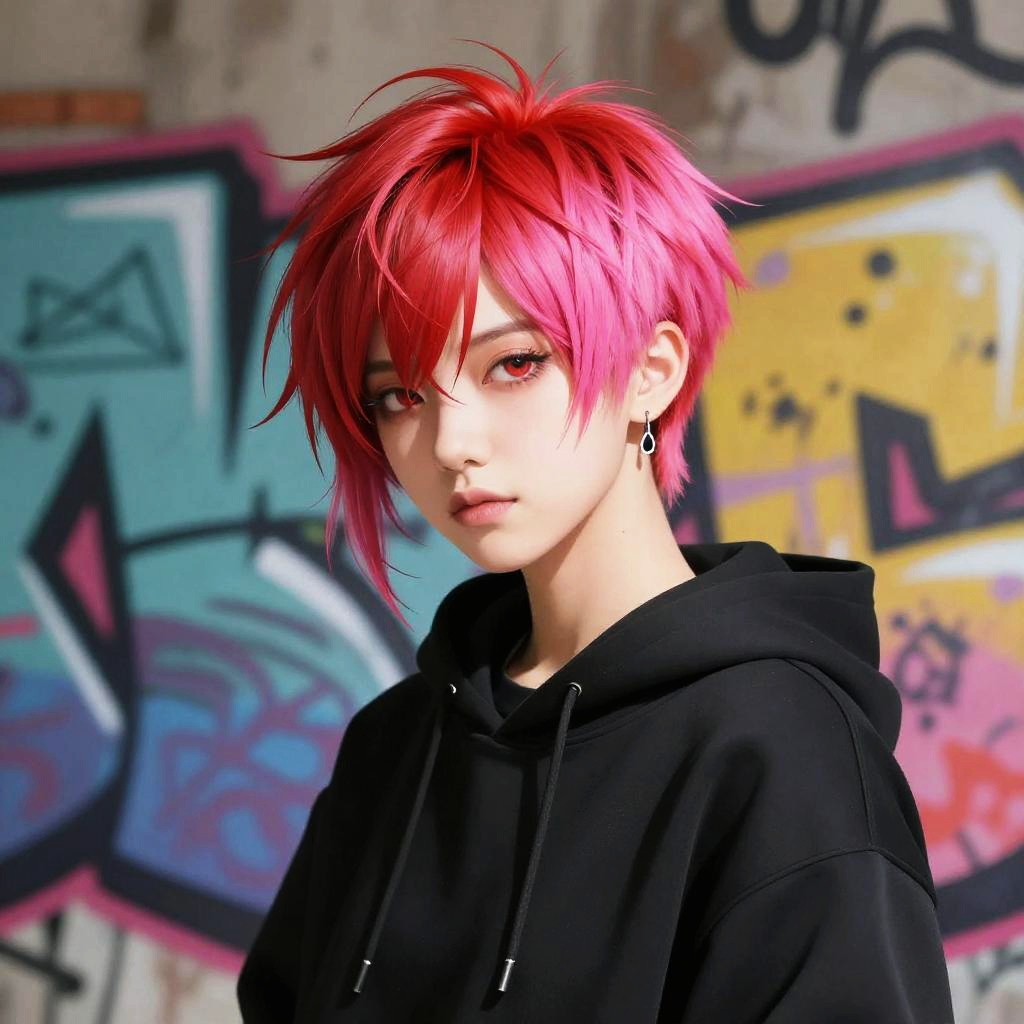 Bold red and pink short hair with edgy spikes, urban street style, graffiti wall backdrop, vivid colors, high contrast lighting, dynamic and confident expression, modern digital illustration