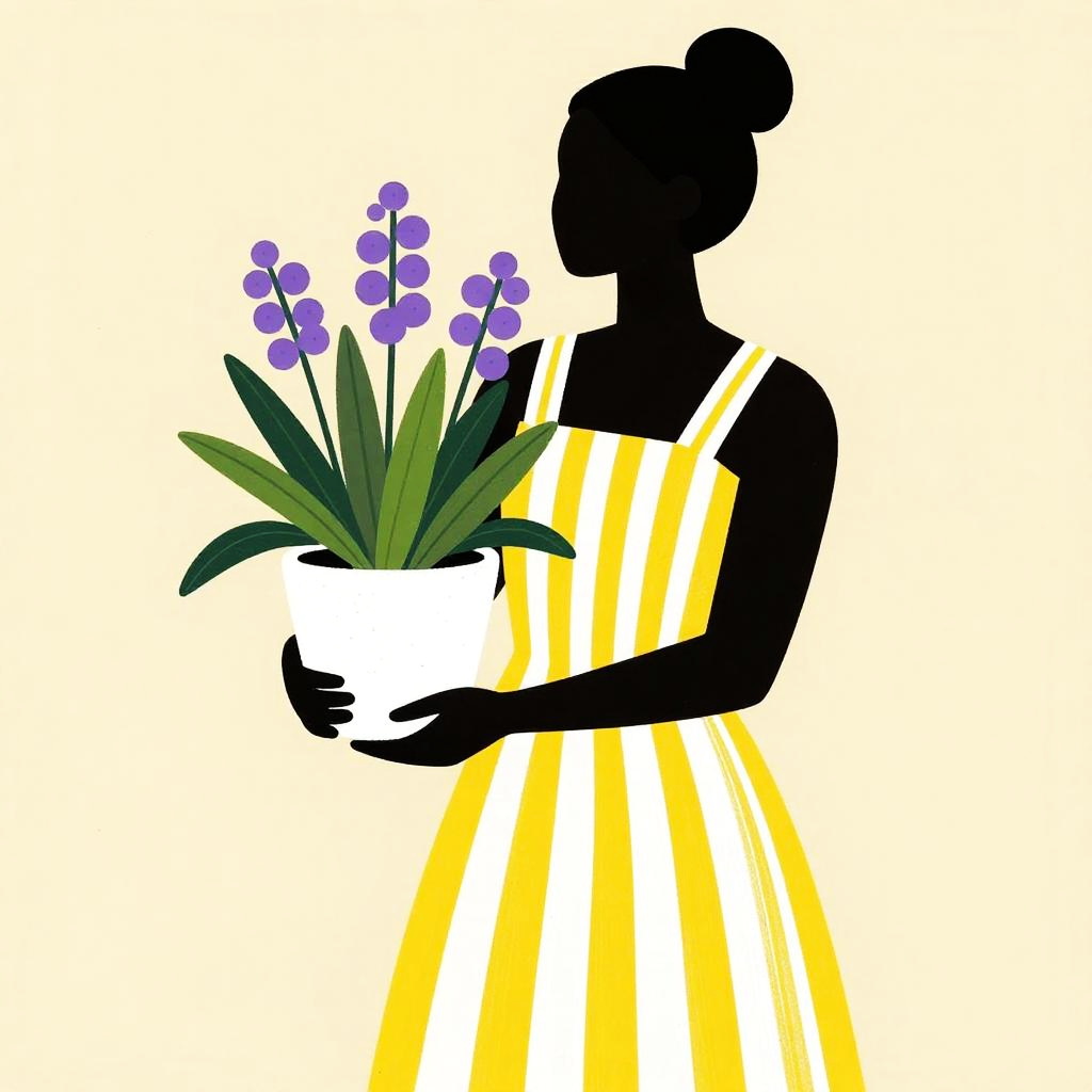 A stylized digital painting of a black silhouette woman with a bun, wearing a yellow and white striped dress, holding a white, textured pot with green leaves and purple flowers. She's standing against a light yellow background. The image has a modern, abstract feel with bold, contrasting colors and a minimalist aesthetic.