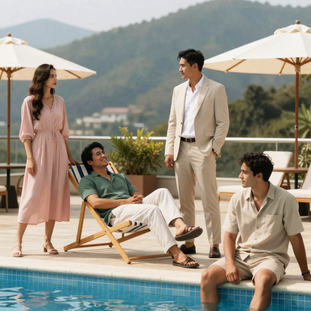 Photograph of four people by a pool. Woman in pink dress standing, man in beige suit standing, man in green shirt reclining on lounge chair, man in beige shirt sitting on pool edge. Mountain background, poolside chairs and umbrellas. Bright daylight. Woman looking to the side, man in beige suit looking at reclining man, reclining man smiling, man in beige shirt looking down.