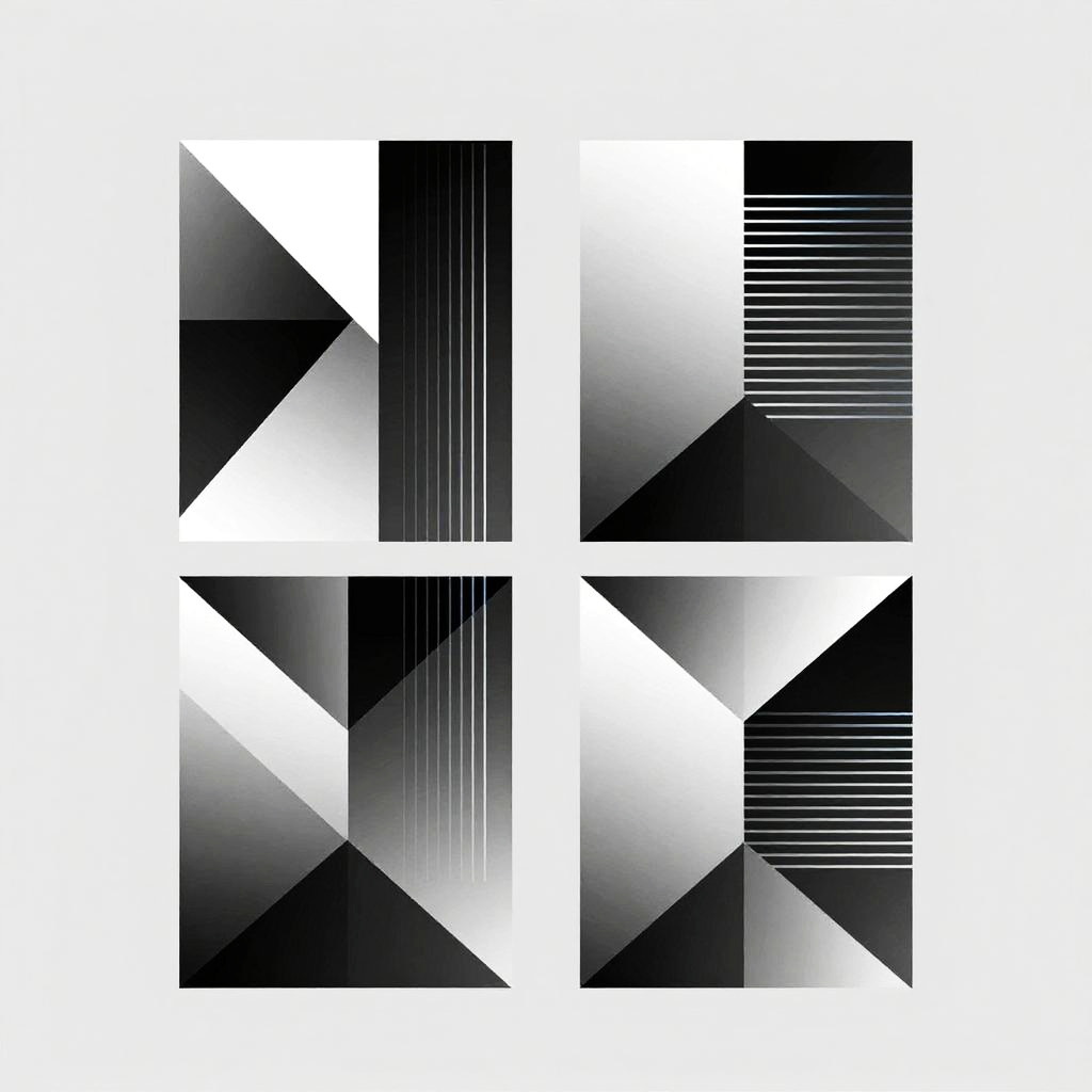 This is a digital abstract artwork featuring a bold, monochromatic design. The image consists of four geometric shapes arranged in a 2x2 grid. Each shape is a combination of black and white, with varying textures and patterns. The top left and bottom left shapes have sharp, angled triangles with a gradient from black to white. The top right and bottom right shapes feature vertical lines in black, with some lines extending into white spaces. The overall composition is modern and minimalist, with high contrast and clean lines. The background is plain white, highlighting the stark black and white elements. The style is reminiscent of op art or minimalism.