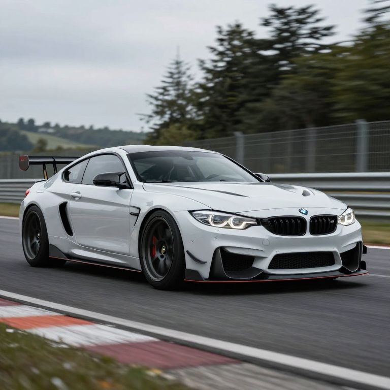 Photograph of a white BMW coupe speeding on a racetrack. The car has black accents, including a large rear spoiler and black alloy wheels with red brake calipers. The sleek, aerodynamic design features aggressive headlights and a prominent BMW grille. The racetrack has a red and white curbing on the left and a metal guardrail on the right. The background shows blurred green trees and a cloudy sky, indicating motion and speed. The car's windows are slightly tinted, and the overall scene conveys a sense of dynamic motion and high-performance driving.