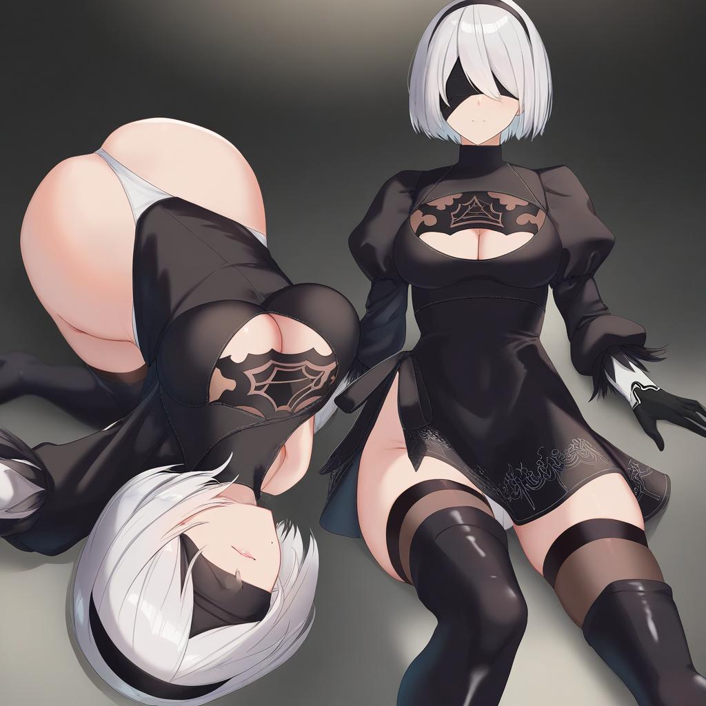 2b (nier:automata), nier (series), 1girl, mole under mouth, short hair, white hair, black hairband, medium breasts, large breasts, cleavage cutout, cleavage, ass, thighs, thigh boots, highleg leotard, black thighhighs, black dress, black gloves, juliet sleeves, black blindfold, by artist setmen, leet