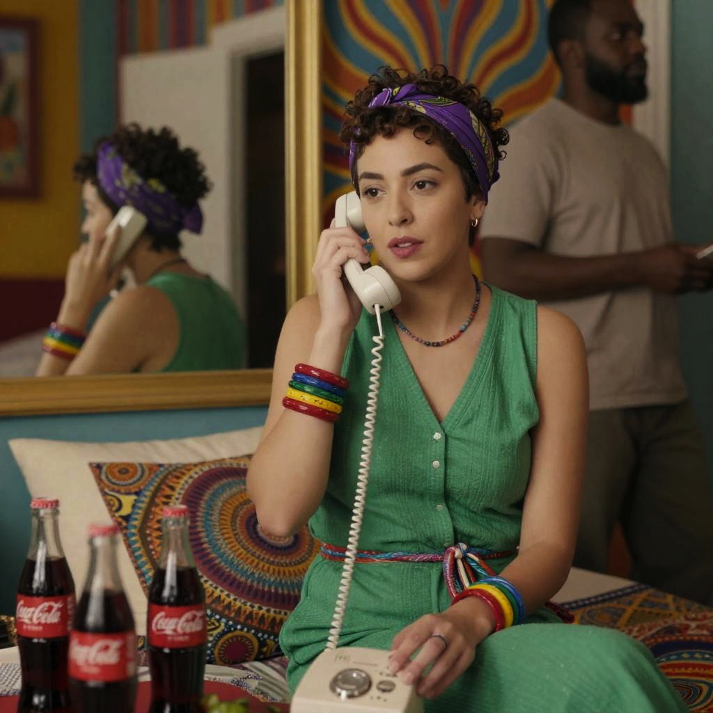 Photograph of a woman with short curly hair, purple headscarf, green sleeveless top, colorful bracelets, and necklace, talking on a vintage phone. She sits on a bed with patterned pillows and Coca-Cola bottles in the foreground. Another person with dark skin and a beard stands in the background. Reflection in a mirror shows her talking. The room has a colorful, psychedelic wallpaper.