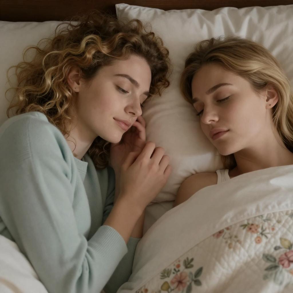 Photograph of two women in bed, woman on left with curly blonde hair, light green sweater, gentle expression, woman on right with blonde hair, white pillow, eyes closed, quilt with floral pattern, soft lighting, intimate setting.
