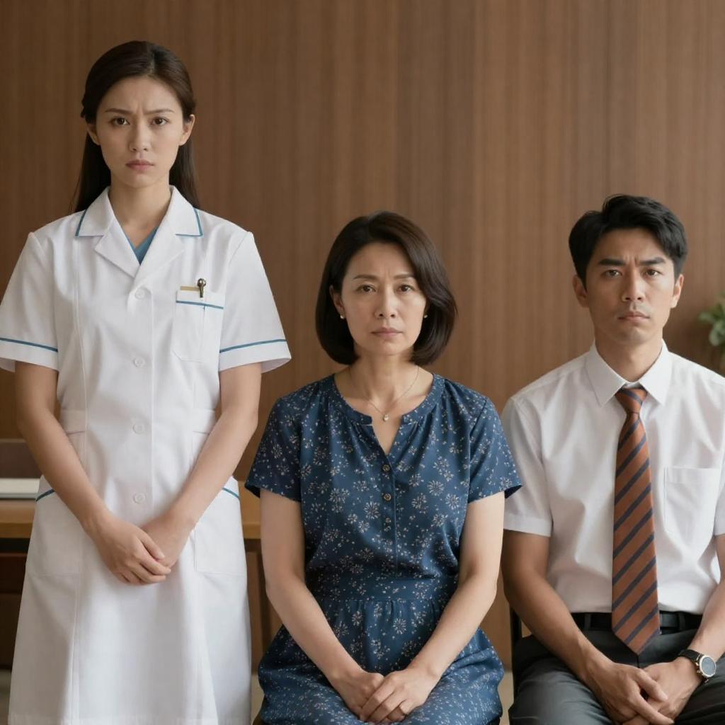Photograph of three people in a wooden-paneled room. A stern-looking woman in a white uniform stands to the left, a middle-aged woman with short black hair in a blue floral dress sits in the center, and a serious-looking man in a white shirt and orange-striped tie sits to the right.