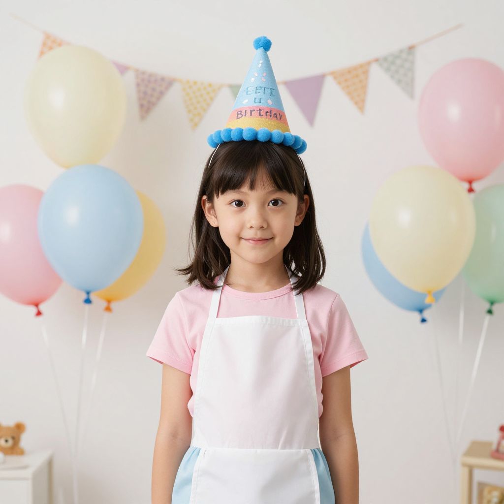 Photograph of a young Asian girl with black hair, wearing a blue birthday hat, pink shirt, and white apron, standing in a bright room