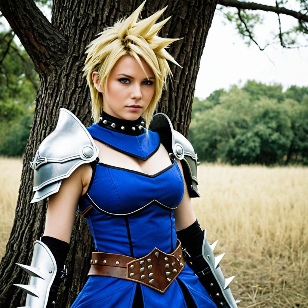 Female cloud strife cosplay,1girl, solo, blonde hair, armor, spiked hair, shoulder armor, gloves, short hair, blue eyes, breasts, outdoors, tree, dress, choker, cowboy shot