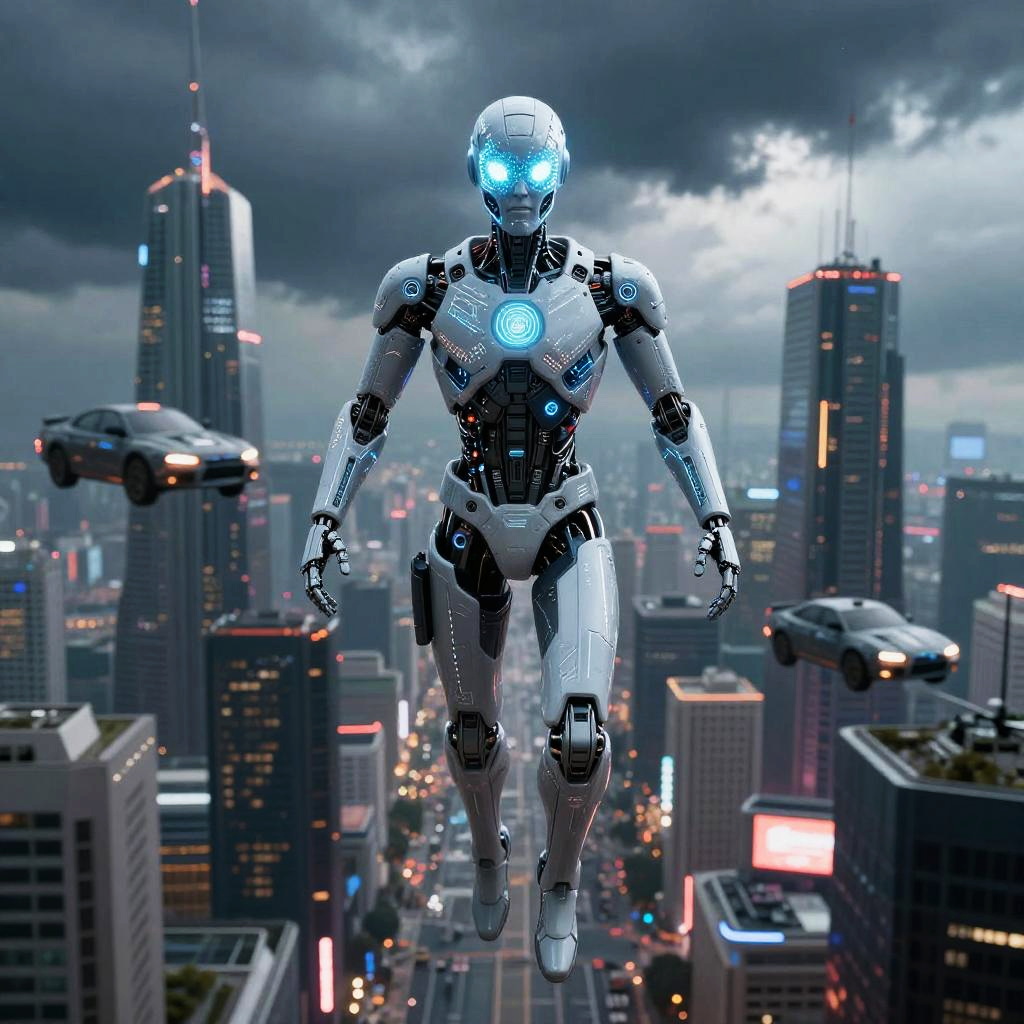 Futuristic AI Superhero Over City