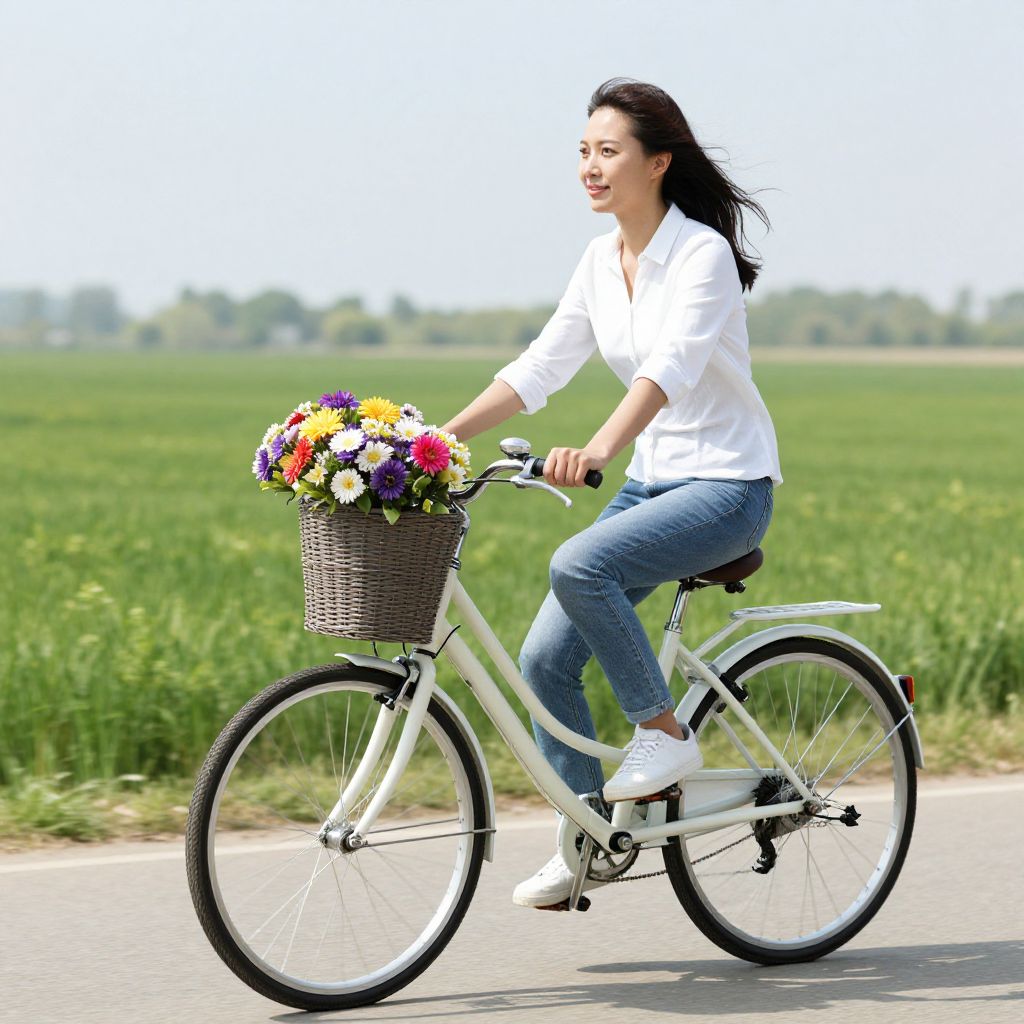 Woman Cycling with Flower Basket
