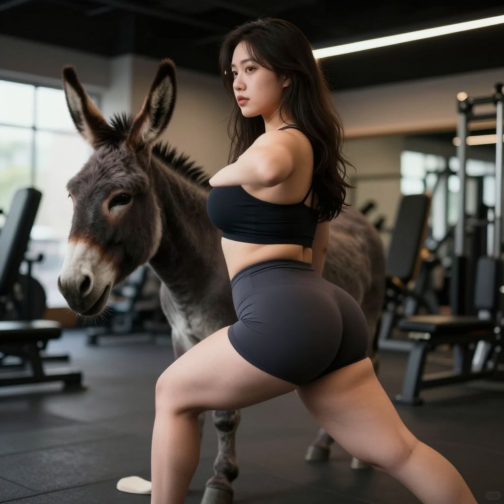 Photograph of an Asian woman with long black hair, wearing a black sports bra and black high-waisted shorts, standing in a gym. She has a toned, curvy physique with prominent buttocks and medium-sized breasts. She stands with one leg forward, facing slightly to the right, looking over her shoulder. A donkey is positioned to her left, standing still with its head facing forward. The gym has dark flooring, weight machines, and bright windows in the background. The image has a realistic, slightly stylized aesthetic, emphasizing the contrast between the woman's athletic build and the donkey's natural form.