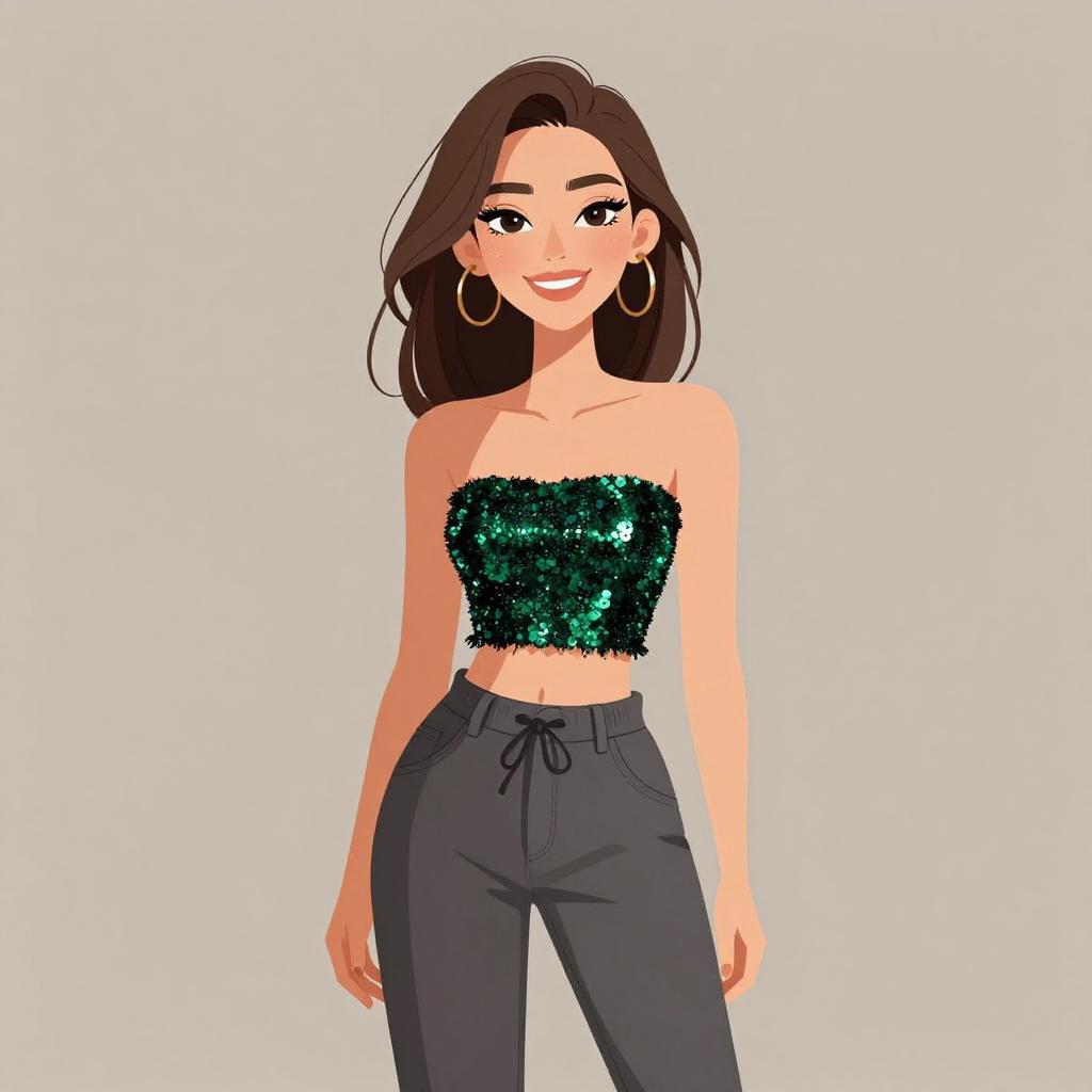 Digital illustration of a smiling woman with long brown hair, wearing a sequined green tube top and high-waisted black pants.