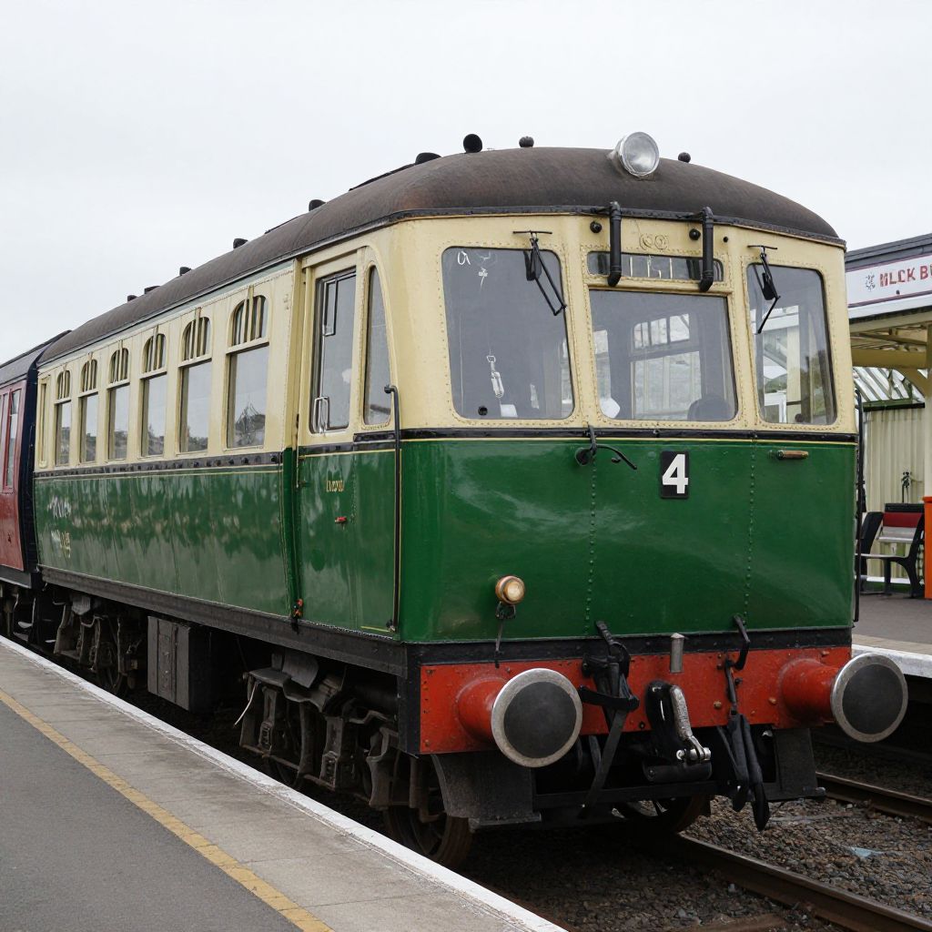 Vintage green and cream train car with large front windows and number "4" on the front, parked at a station.