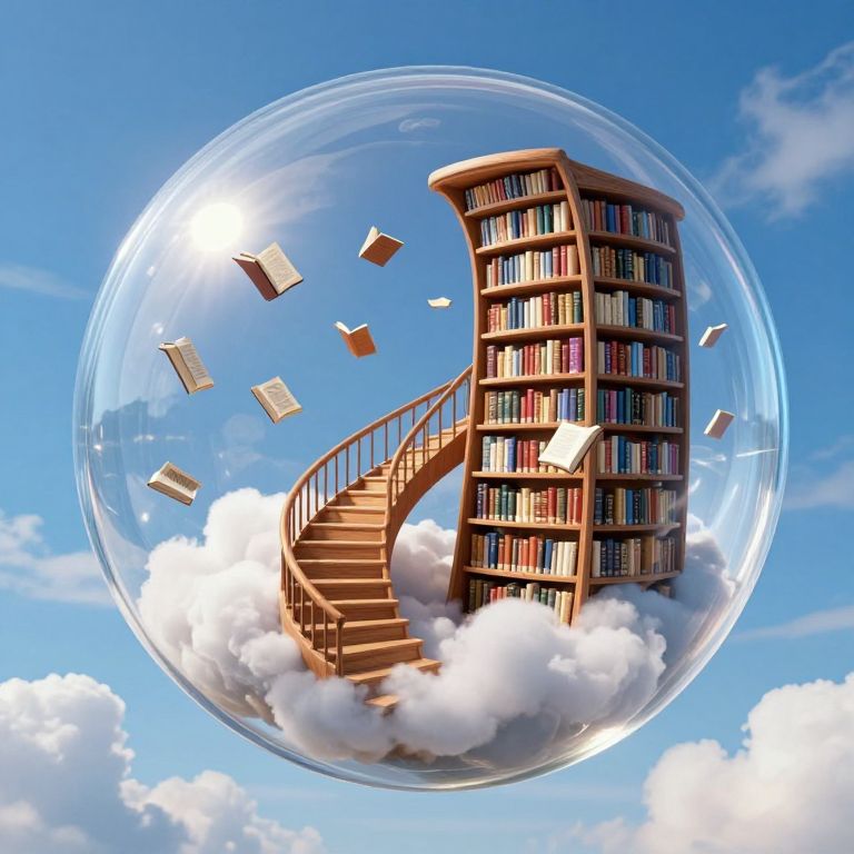 Digital artwork depicting a floating, wooden spiral library tower encased in a transparent, spherical bubble. The tower, with multiple shelves filled with colorful books, is elevated above fluffy white clouds against a bright blue sky. Several open books are suspended mid-air within the bubble, appearing to float freely. The glass sphere reflects sunlight, adding a radiant glow. The image combines surrealism with a whimsical, fantasy-like atmosphere, emphasizing the magical and dreamlike quality of the floating library and books. The style is vibrant and detailed, with sharp contrasts between the blue sky, white clouds, and the warm tones of the wooden library.
