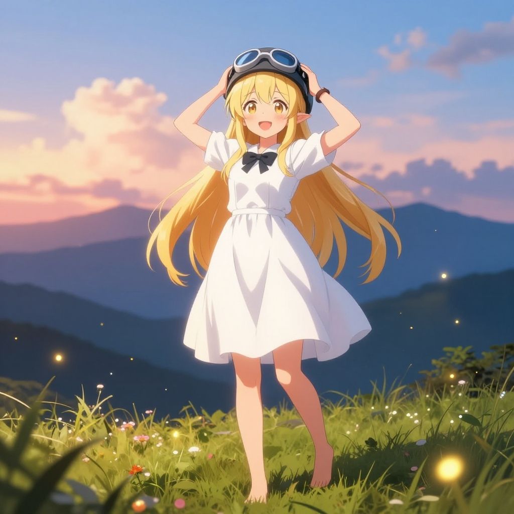 Digital anime-style illustration of a young girl with long, blonde hair and yellow eyes, standing barefoot in a grassy meadow. She wears a white, sleeveless, knee-length dress with a black bow at the neckline, and a pair of goggles on her head. Her hands are raised, adjusting the goggles. The background features rolling, forested hills under a bright blue sky with scattered clouds. Small, glowing fireflies are scattered around the meadow, adding a magical touch. The girl's elf-like ears and expressive eyes give her a whimsical appearance. The sunlight casts a warm glow, enhancing the serene, picturesque setting.