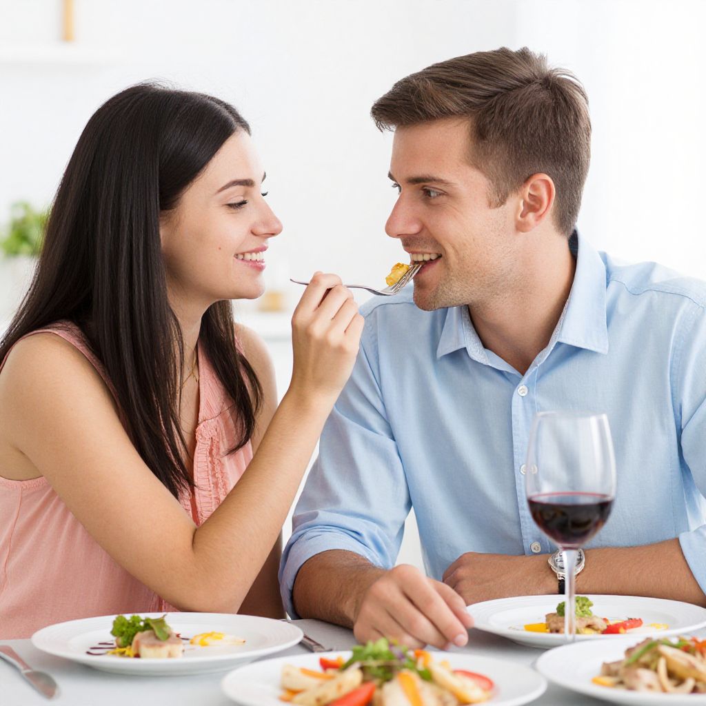 Photograph of a cute couple enjoying a romantic dinner. The woman with long black hair, wearing a pink sleeveless top, is smiling and feeding the man with short brown hair, dressed in a light blue shirt, a bite of food from her fork. They're sitting at a table filled with various dishes, including a glass of red wine in front of the man. Bright, airy room in the background.