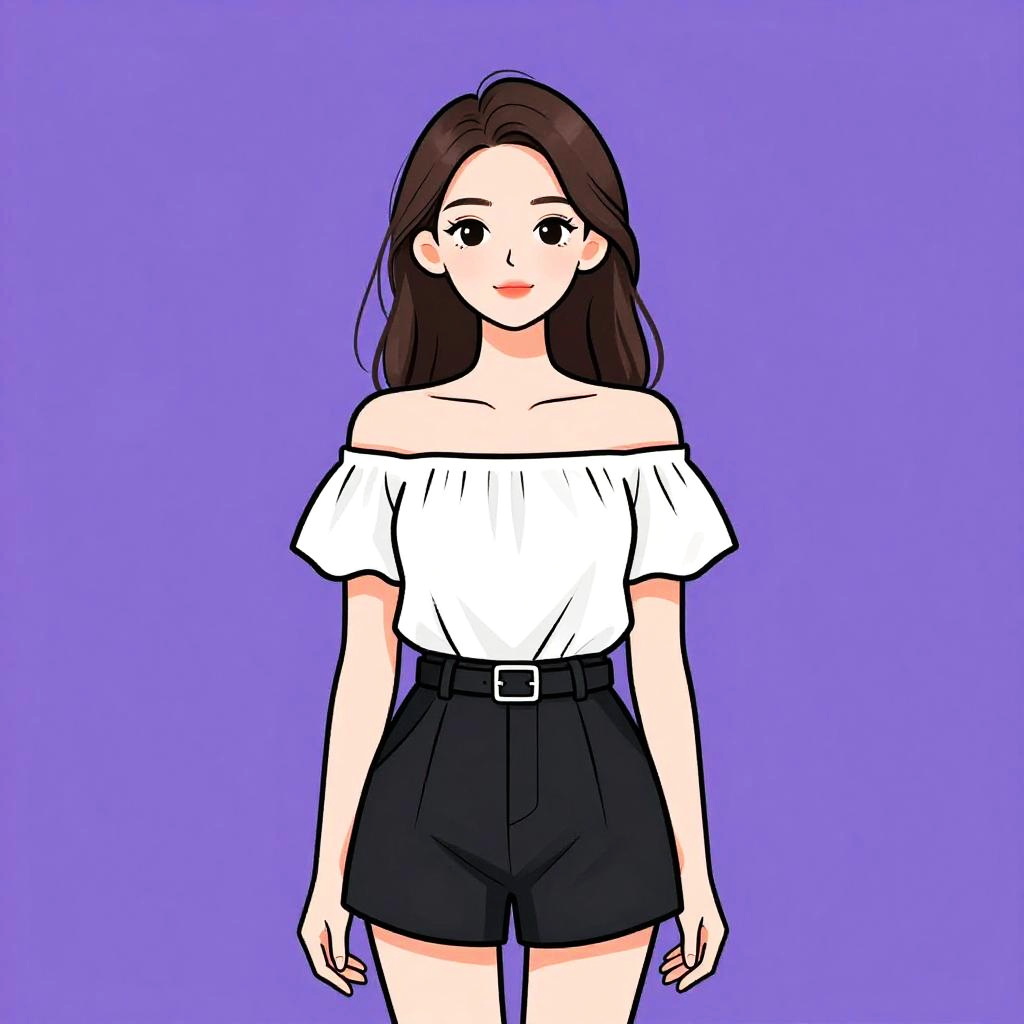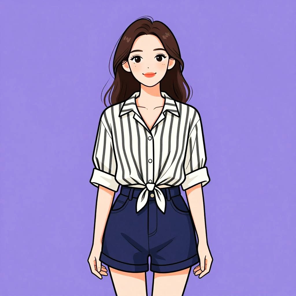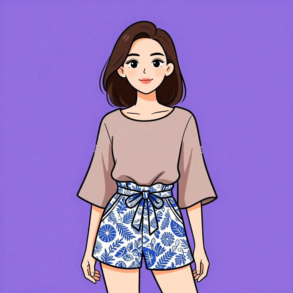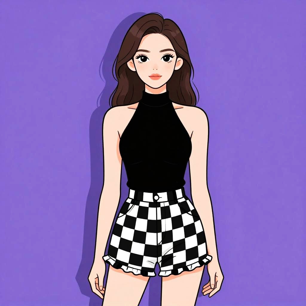 Woman with pretty face and pretty hair. Woman, contemporary eclectic, sheer pink blouse with solid pastel blue front panel, adorned with black bead details, long bishop sleeves, rounded neckline, paired with high-waisted, houndstooth patterned shorts in black and white, grey knitted beanie, photo studio background. --sref 1467