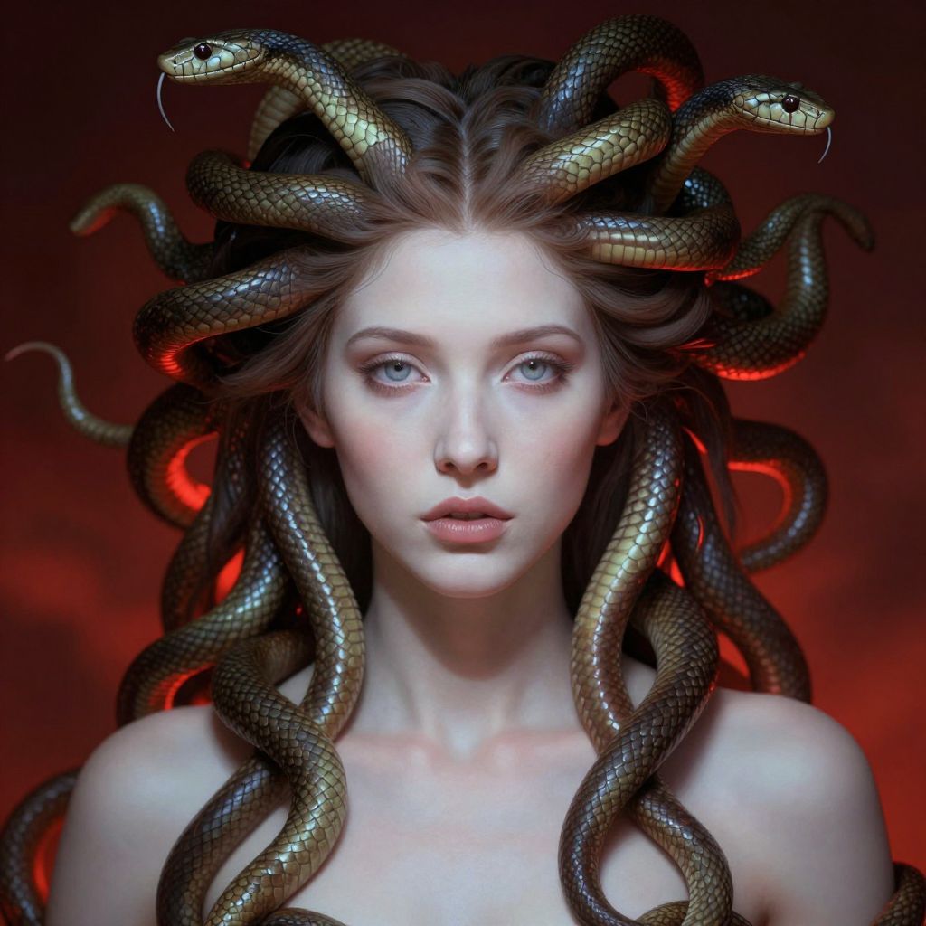 Digital artwork of a pale, blue-eyed woman with long, wavy brown hair entwined by multiple snakes, against a dark red background. Her