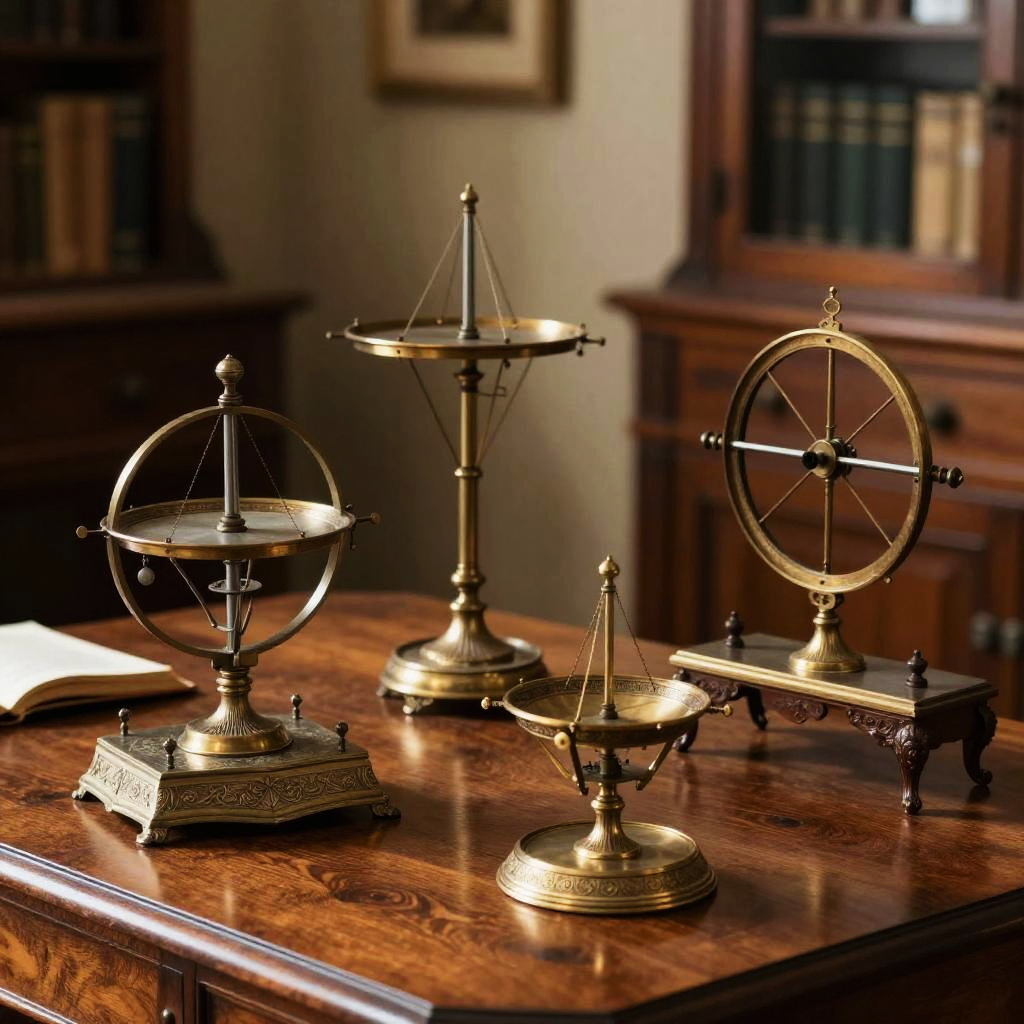 Displayed antique scientific instruments on polished wooden table, soft diffused lighting, intricate metallic details with delicate engravings, vintage study room ambiance, scholarly atmosphere