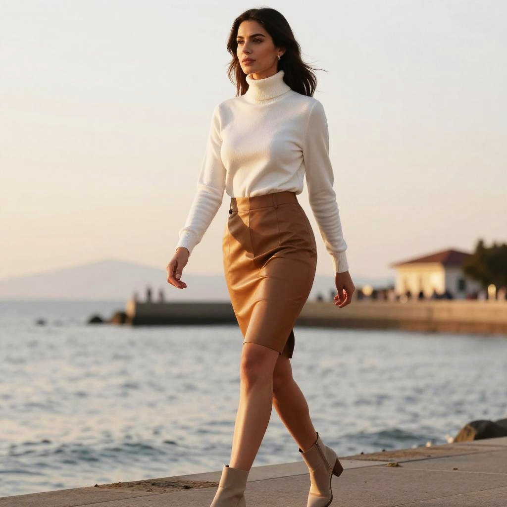 A woman, modern chic in a white turtleneck and fitted camel leather pencil skirt, beige ankle boots, captured in a sunset stroll on the shore, in the style of pa works. Sexy. Pretty face and beutiful eyes