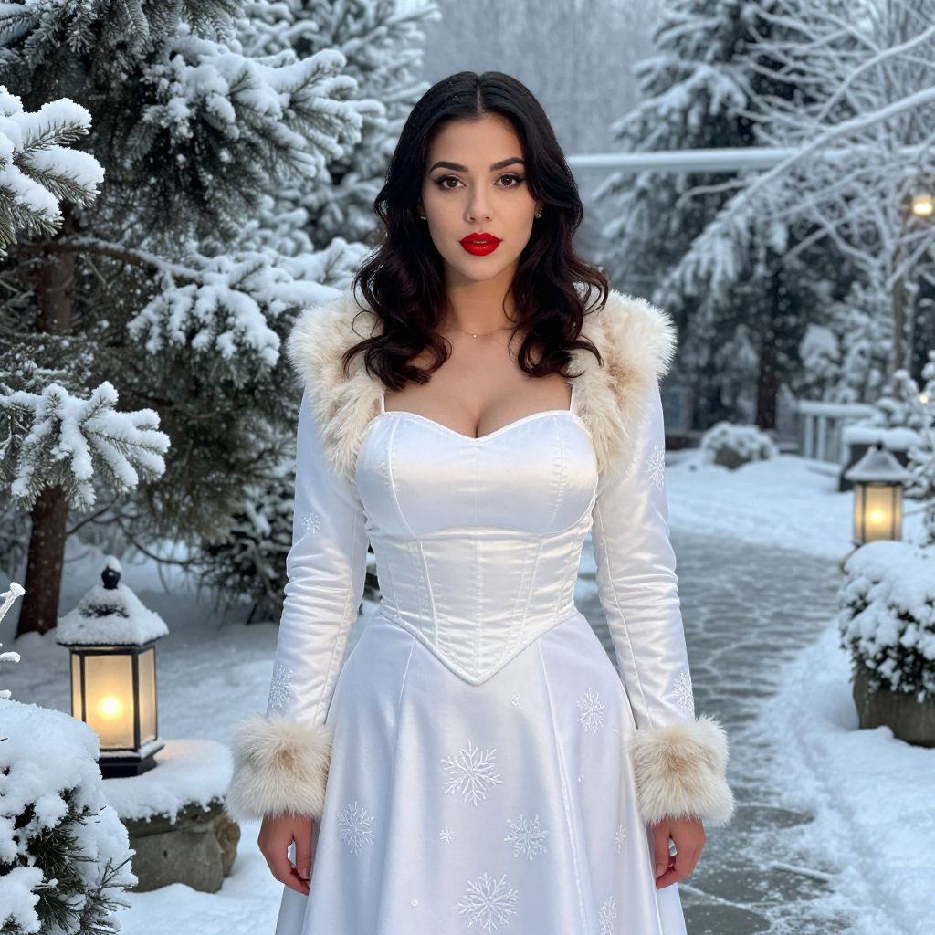 A vibrant winter white party outfit is worn by a young woman with bold crimson lips and deep brown eyes, standing in a frosty winter garden with snow-laden pines and a glowing lantern on a stone path, the outfit features a fitted bodice, long white skirts with snowflake embroidery, and warm velvet accents, realistic cinematic lighting. The woman has big tits and cute face