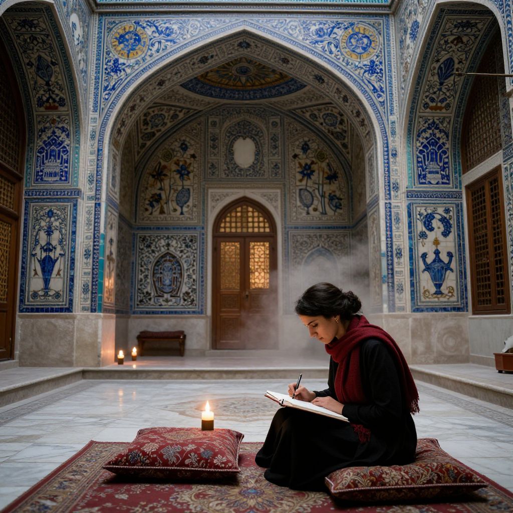 Photograph of a woman with dark hair in a black headscarf and maroon shawl, sitting cross-legged on a red-patterned rug in a beautifully tiled, arched room with blue and white intricate patterns. She is writing in a notebook, surrounded by four lit candles on a white marble floor. The background features ornate arches, wooden doors with lattice windows, and decorative blue and white tiles depicting floral and geometric designs. Smoke gently rises from candles, adding a mystical atmosphere. The woman appears focused, creating a serene and contemplative scene.