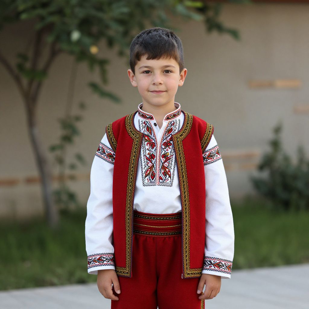 Photograph of a young boy with short black hair, wearing a white embroidered shirt, red vest, and red pants, standing outdoors against a blurred green