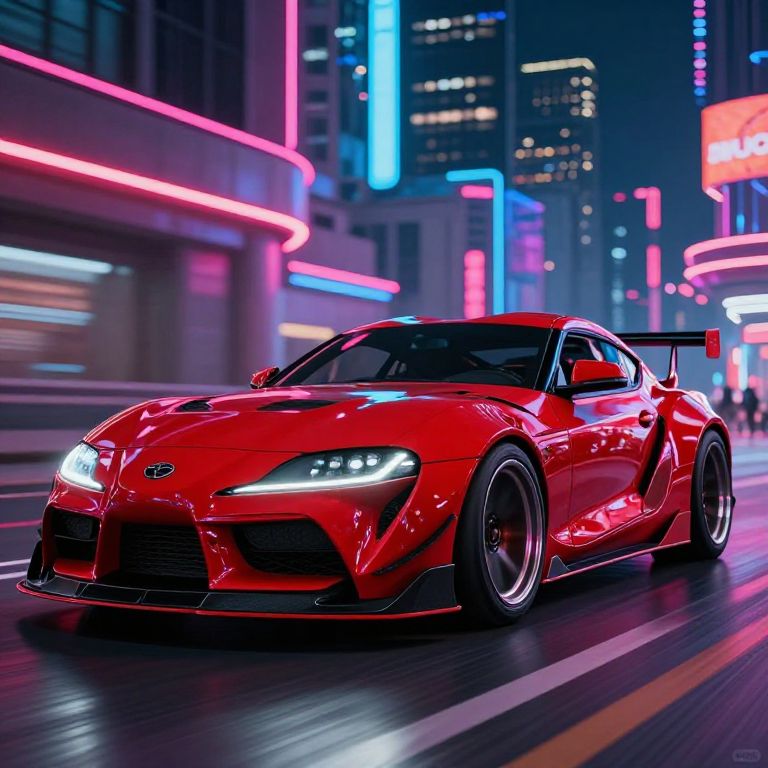 Supra MK4 wide body kit, aggressive stance, glossy red paint, ultra detailed aero parts, vibrant urban night wallpaper, neon lights reflecting off sleek curves, dynamic angle emphasizing speed and power, futuristic street style.